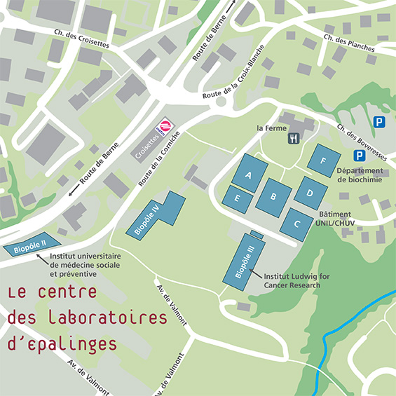 By Metro from Lausanne rail station, you should take the metro (M2) to the end station "Les Croisettes". When getting out of the station follow the direction "sortie chemin des Boveresses". Then you will see the "Centre des Laboratoires d'Epalinges (CLE) on your right. It is in a complex of rather flat buildings with three round chimneys. The main entrance is indicated by a blue placemark on the map. Last update: Friday, May 5, 2017